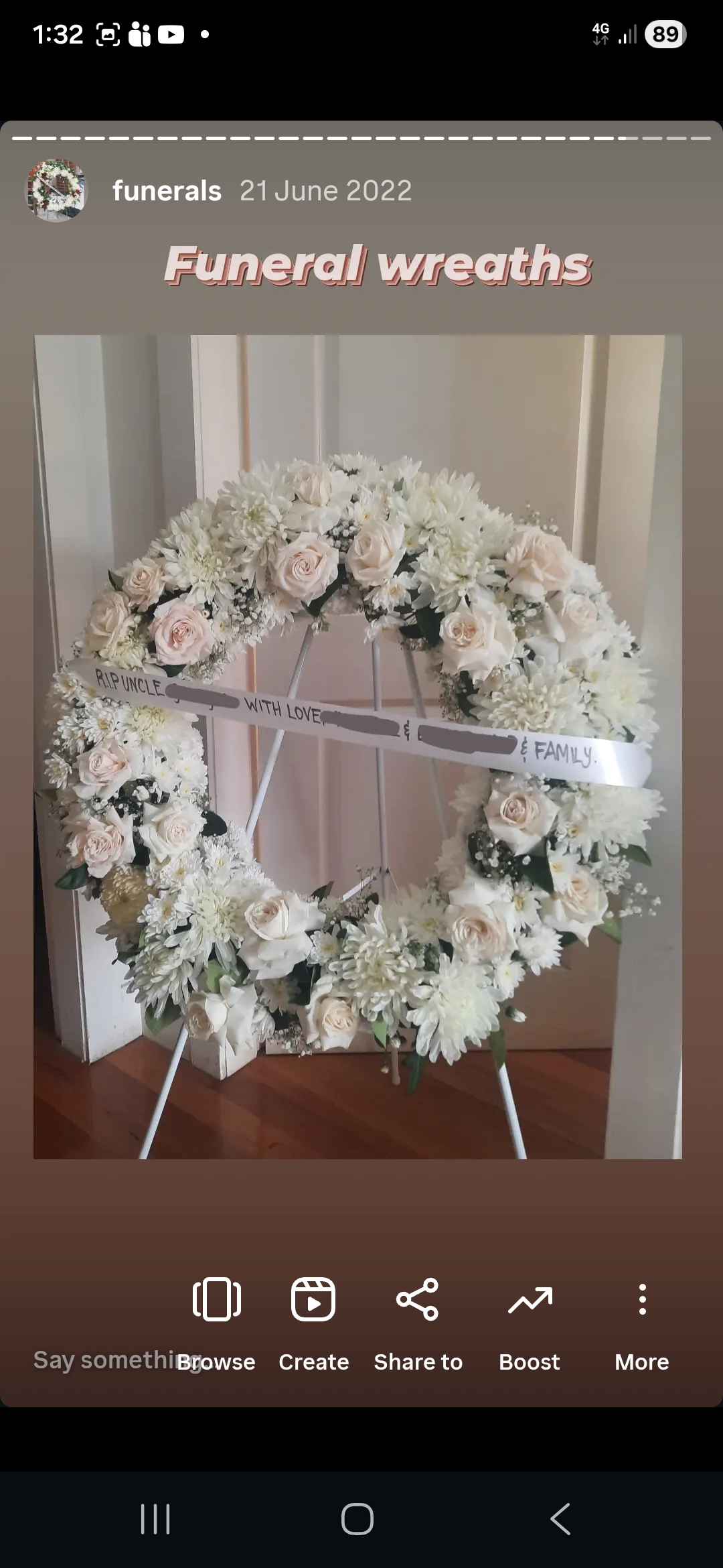 Delicate wreath arrangement in soft white and blush tones with roses and chrysanthemums, expressing enduring affection.